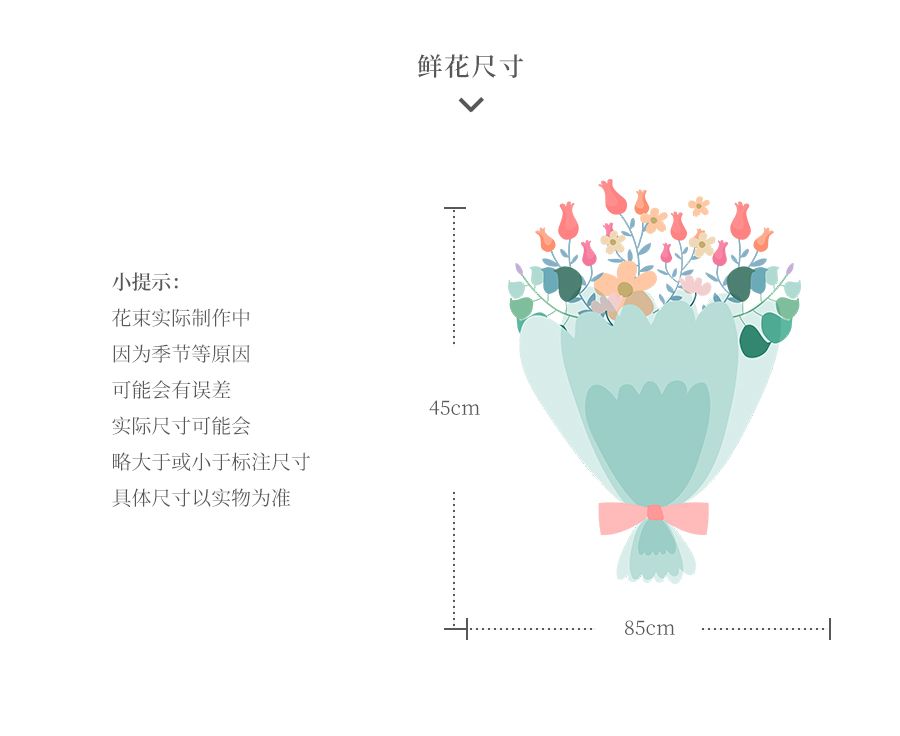 由于鮮花包扎的花藝師不同,可能在花束的形式和搭配上與圖片略有小的區(qū)別,但我們保證鮮花的主花材品種、新鮮程度、數(shù)量、顏色與說明一致,感謝您的理解。
