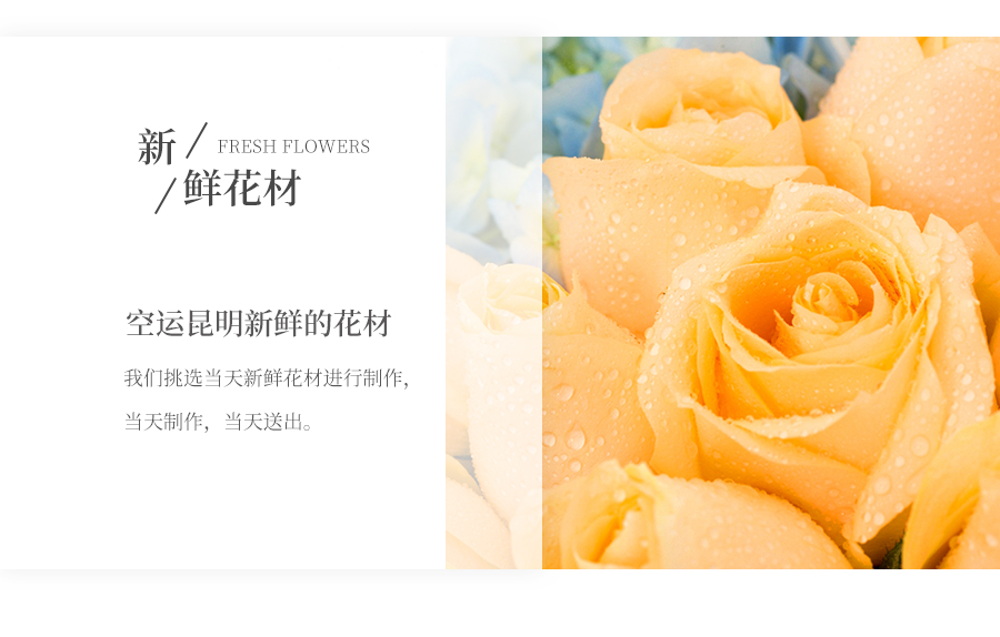 由于鮮花包扎的花藝師不同,可能在花束的形式和搭配上與圖片略有小的區(qū)別,但我們保證鮮花的主花材品種、新鮮程度、數(shù)量、顏色與說(shuō)明一致,感謝您的理解。