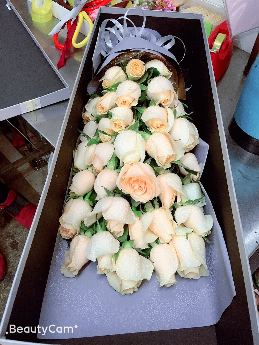 花很不錯,只是可能因為下雨,禮盒濕了一點,不過沒關系,里面的花很好,非常新鮮
