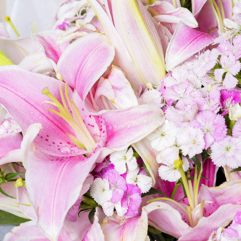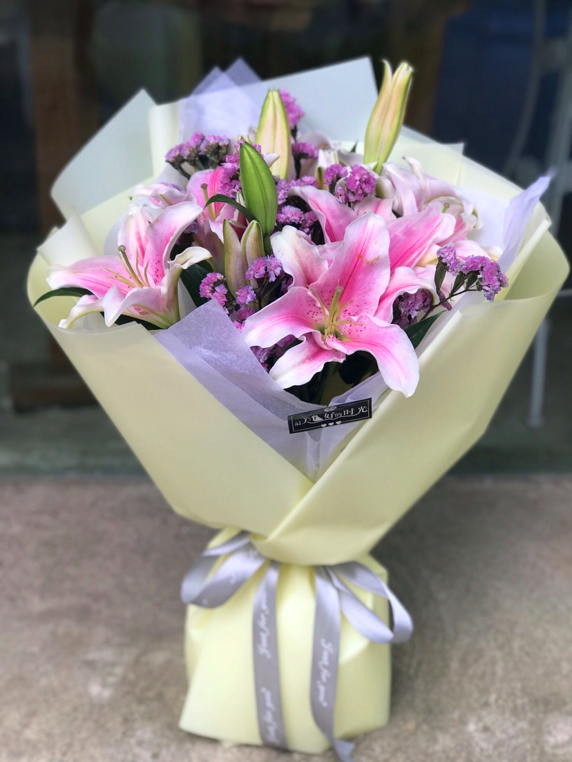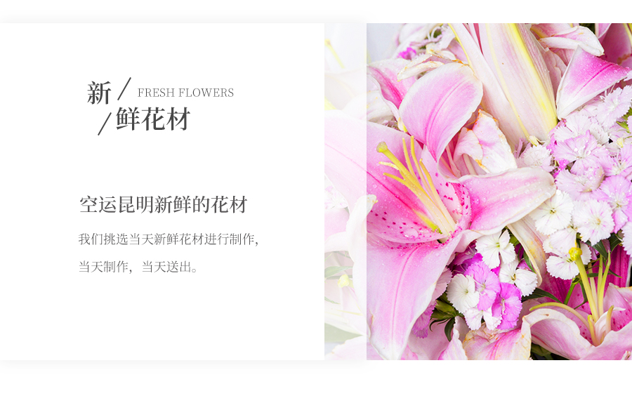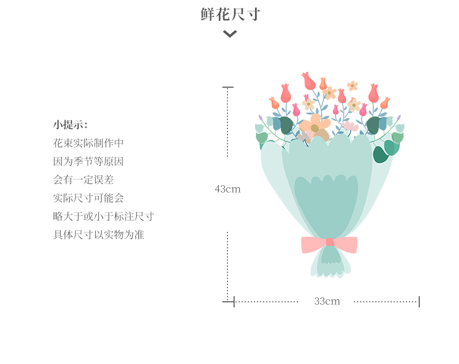 由于鮮花包扎的花藝師不同,可能在花束的形式和搭配上與圖片略有小的區(qū)別,但我們保證鮮花的主花材品種、新鮮程度、數(shù)量、顏色與說明一致,感謝您的理解。