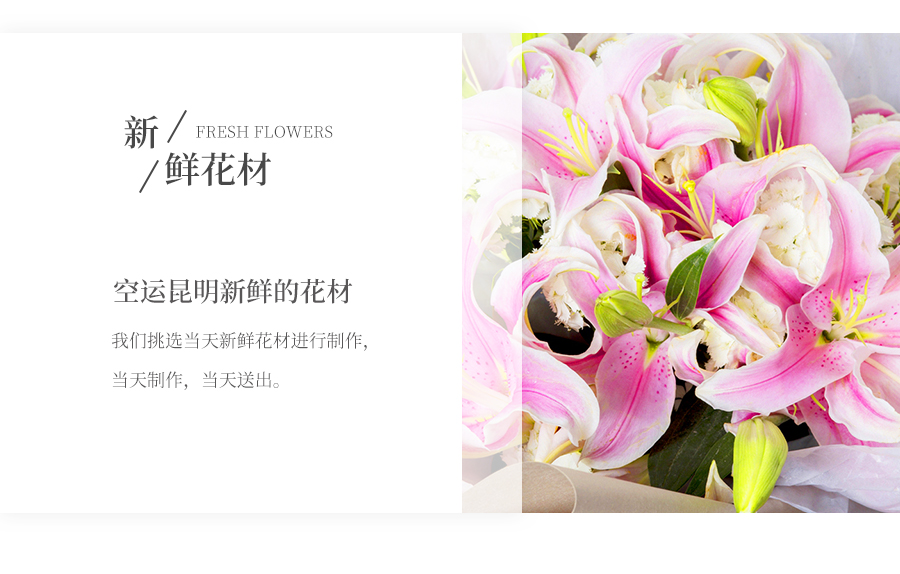 由于鮮花包扎的花藝師不同,可能在花束的形式和搭配上與圖片略有小的區(qū)別,但我們保證鮮花的主花材品種、新鮮程度、數(shù)量、顏色與說明一致,感謝您的理解。
