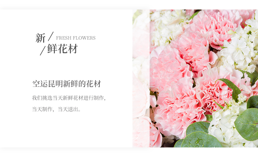 由于鮮花包扎的花藝師不同,可能在花束的形式和搭配上與圖片略有小的區(qū)別,但我們保證鮮花的主花材品種、新鮮程度、數(shù)量、顏色與說明一致,感謝您的理解。