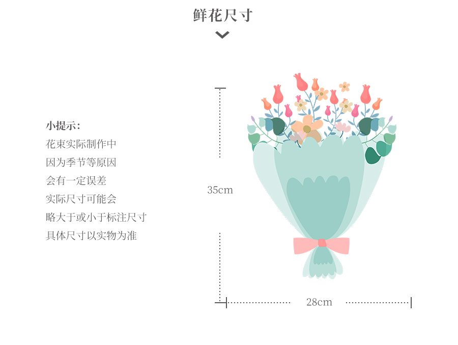 由于鮮花包扎的花藝師不同,可能在花束的形式和搭配上與圖片略有小的區(qū)別,但我們保證鮮花的主花材品種、新鮮程度、數(shù)量、顏色與說明一致,感謝您的理解。