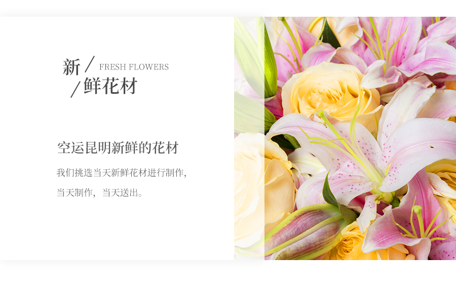 由于鮮花包扎的花藝師不同,可能在花束的形式和搭配上與圖片略有小的區(qū)別,但我們保證鮮花的主花材品種、新鮮程度、數(shù)量、顏色與說明一致,感謝您的理解。