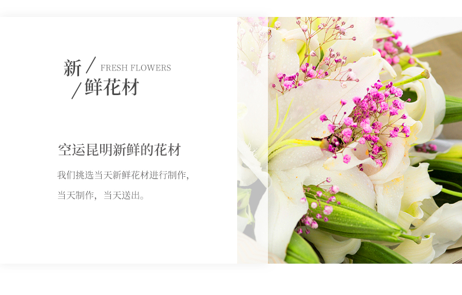 由于鮮花包扎的花藝師不同,可能在花束的形式和搭配上與圖片略有小的區(qū)別,但我們保證鮮花的主花材品種、新鮮程度、數(shù)量、顏色與說(shuō)明一致,感謝您的理解。