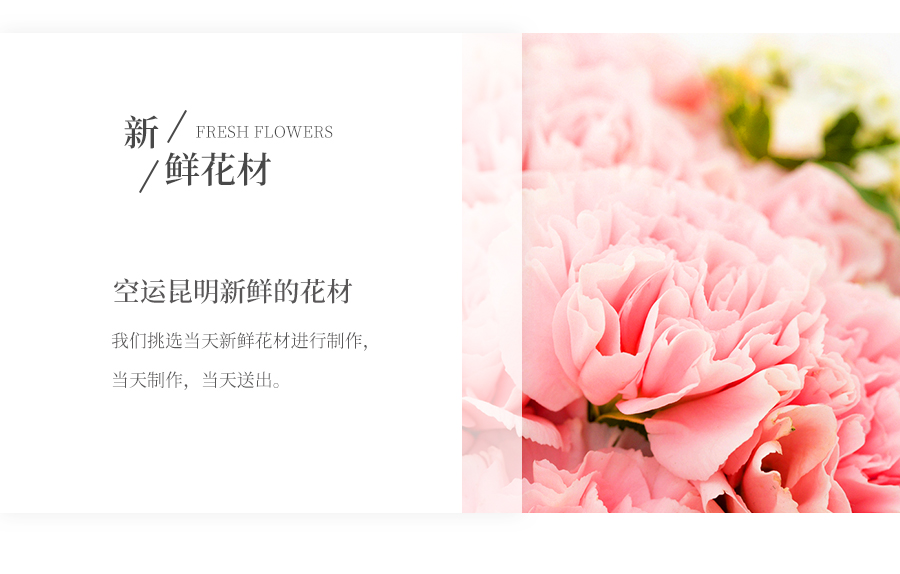 由于鮮花包扎的花藝師不同,可能在花束的形式和搭配上與圖片略有小的區(qū)別,但我們保證鮮花的主花材品種、新鮮程度、數(shù)量、顏色與說明一致,感謝您的理解。