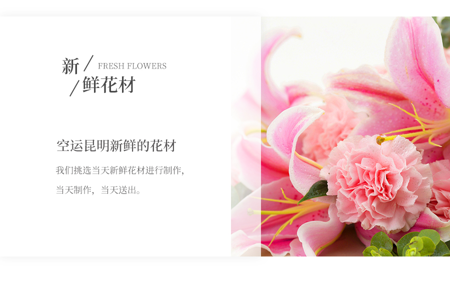 由于鮮花包扎的花藝師不同,可能在花束的形式和搭配上與圖片略有小的區(qū)別,但我們保證鮮花的主花材品種、新鮮程度、數(shù)量、顏色與說明一致,感謝您的理解。