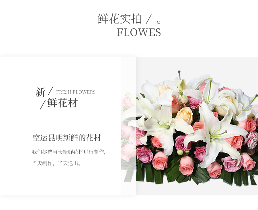 由于鮮花包扎的花藝師不同,可能在花束的形式和搭配上與圖片略有小的區(qū)別,但我們保證鮮花的主花材品種、新鮮程度、數(shù)量、顏色與說明一致,感謝您的理解。
