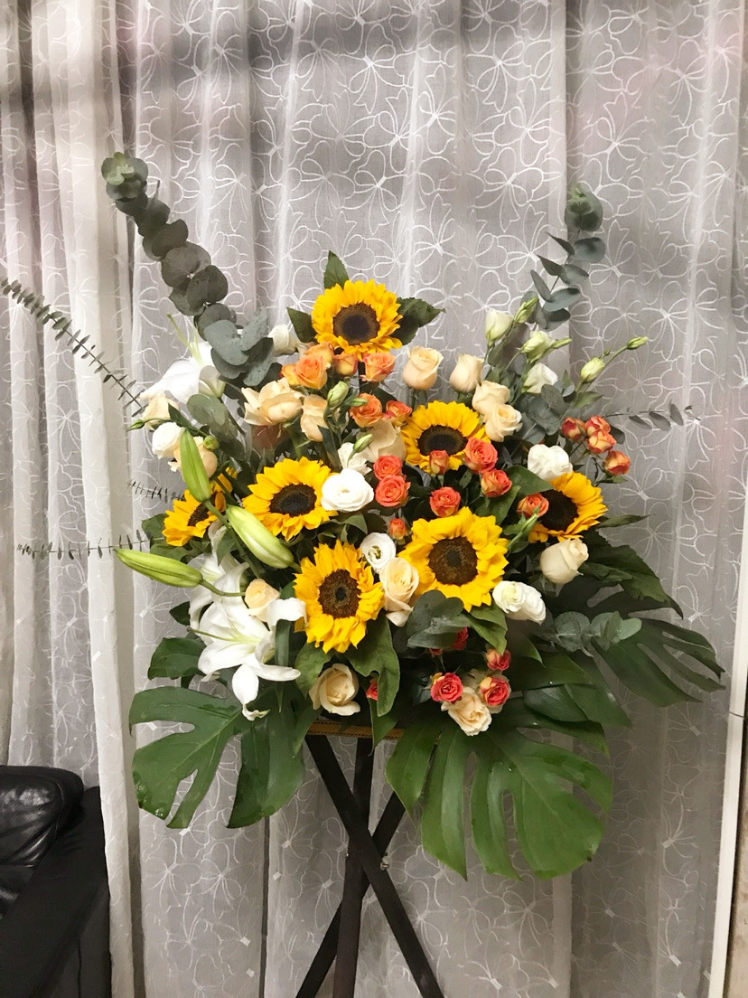 買的十個花籃里面這個花籃是我覺得最陽光的一款花籃了,也是領導最滿意的一款,向日葵很新鮮,還不錯
