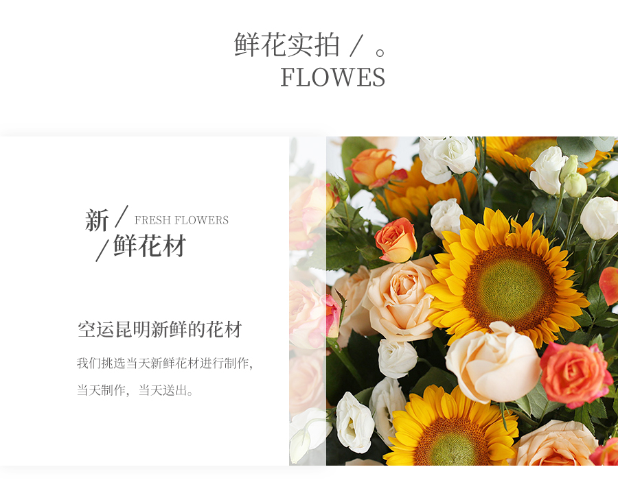 由于鮮花包扎的花藝師不同,可能在花束的形式和搭配上與圖片略有小的區(qū)別,但我們保證鮮花的主花材品種、新鮮程度、數(shù)量、顏色與說明一致,感謝您的理解。