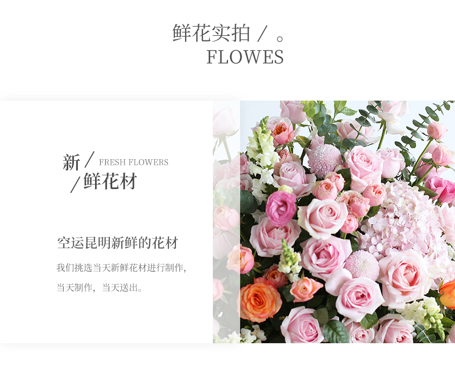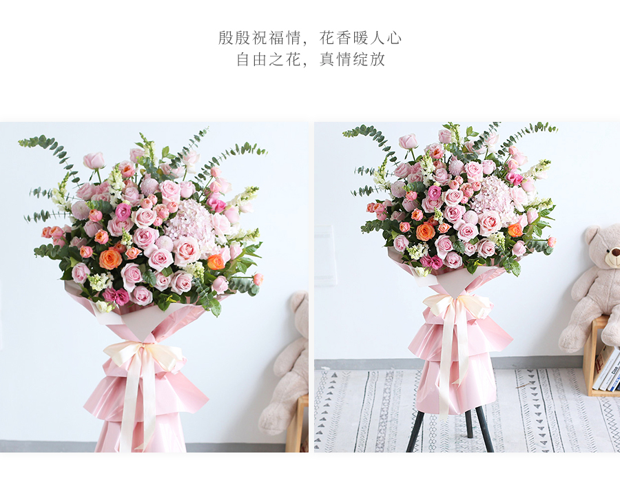 由于鮮花包扎的花藝師不同,可能在花束的形式和搭配上與圖片略有小的區(qū)別,但我們保證鮮花的主花材品種、新鮮程度、數(shù)量、顏色與說明一致,感謝您的理解。