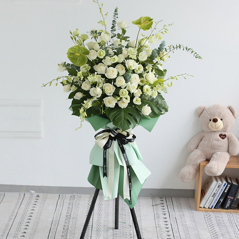 花籃漂亮大氣,花很新鮮,放在店門口很好看,給我招攬不少顧客,還有小姑娘拍照留影哦!好評!