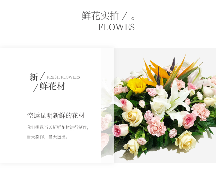 由于鮮花包扎的花藝師不同,可能在花束的形式和搭配上與圖片略有小的區(qū)別,但我們保證鮮花的主花材品種、新鮮程度、數(shù)量、顏色與說(shuō)明一致,感謝您的理解。