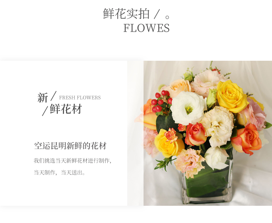 由于鮮花包扎的花藝師不同,可能在花束的形式和搭配上與圖片略有小的區(qū)別,但我們保證鮮花的主花材品種、新鮮程度、數(shù)量、顏色與說(shuō)明一致,感謝您的理解。