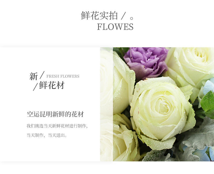 由于鮮花包扎的花藝師不同,可能在花束的形式和搭配上與圖片略有小的區(qū)別,但我們保證鮮花的主花材品種、新鮮程度、數(shù)量、顏色與說明一致,感謝您的理解。