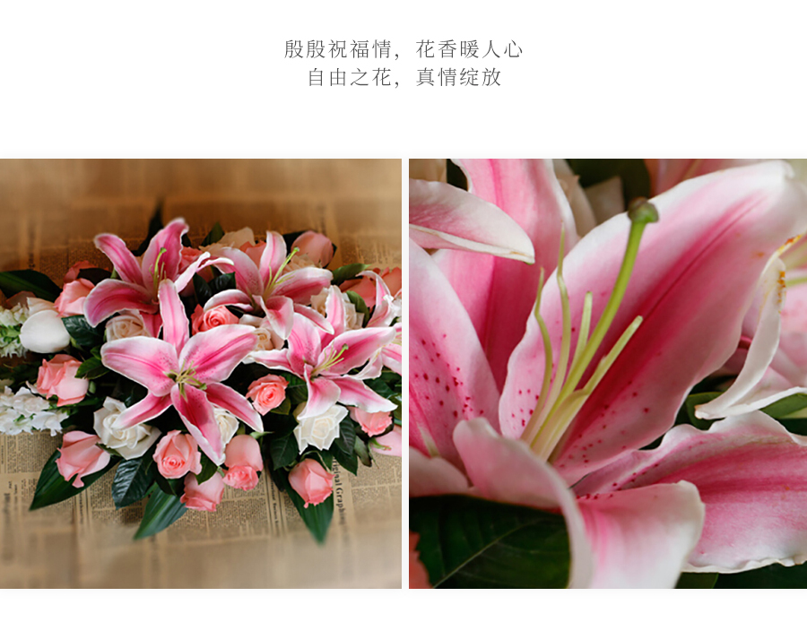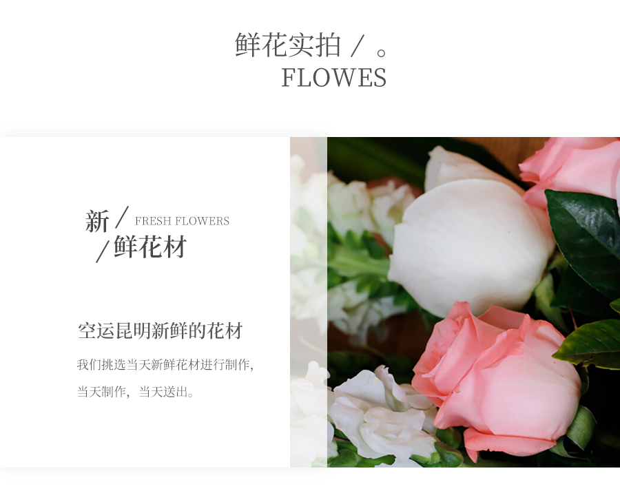 由于鮮花包扎的花藝師不同,可能在花束的形式和搭配上與圖片略有小的區(qū)別,但我們保證鮮花的主花材品種、新鮮程度、數(shù)量、顏色與說明一致,感謝您的理解。