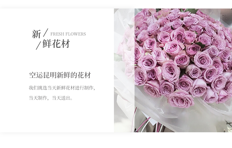 由于鮮花包扎的花藝師不同,可能在花束的形式和搭配上與圖片略有小的區(qū)別,但我們保證鮮花的主花材品種、新鮮程度、數(shù)量、顏色與說明一致,感謝您的理解。