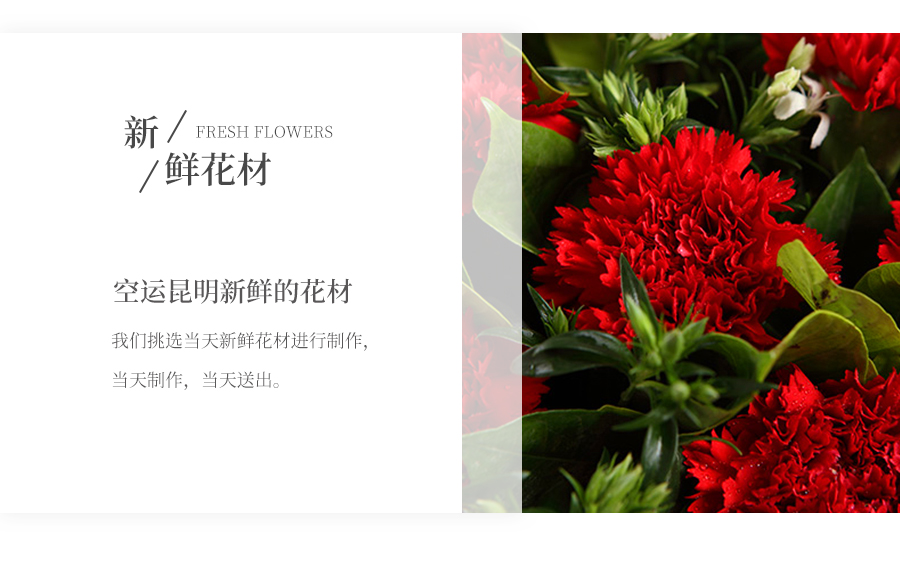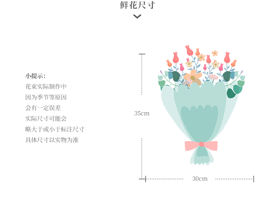 由于鮮花包扎的花藝師不同,可能在花束的形式和搭配上與圖片略有小的區(qū)別,但我們保證鮮花的主花材品種、新鮮程度、數(shù)量、顏色與說(shuō)明一致,感謝您的理解。
