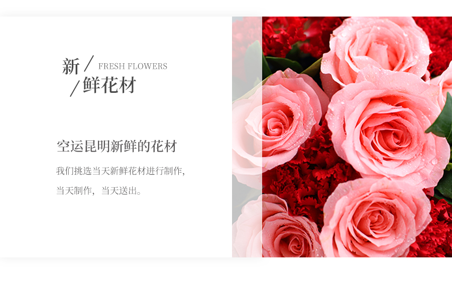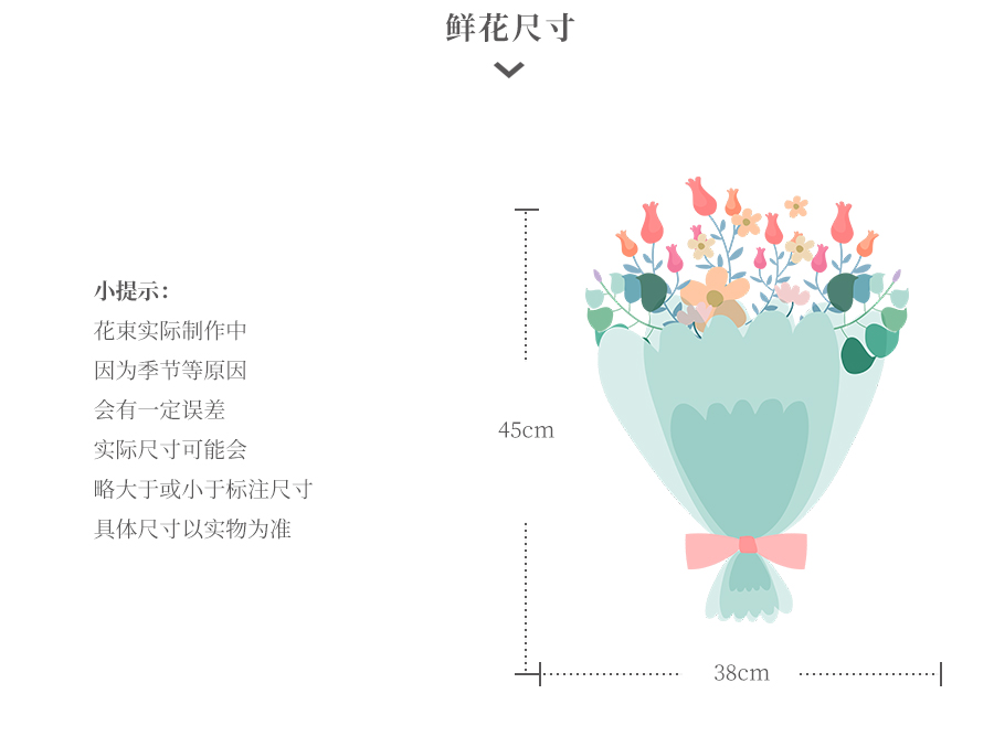 由于鮮花包扎的花藝師不同,可能在花束的形式和搭配上與圖片略有小的區(qū)別,但我們保證鮮花的主花材品種、新鮮程度、數(shù)量、顏色與說(shuō)明一致,感謝您的理解。
