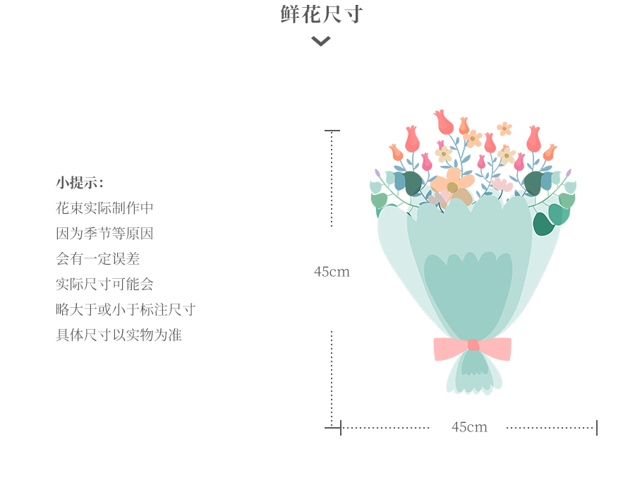 由于鮮花包扎的花藝師不同,可能在花束的形式和搭配上與圖片略有小的區(qū)別,但我們保證鮮花的主花材品種、新鮮程度、數(shù)量、顏色與說(shuō)明一致,感謝您的理解。