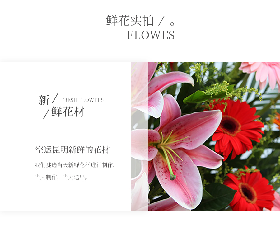 由于鮮花包扎的花藝師不同,可能在花束的形式和搭配上與圖片略有小的區(qū)別,但我們保證鮮花的主花材品種、新鮮程度、數(shù)量、顏色與說明一致,感謝您的理解。