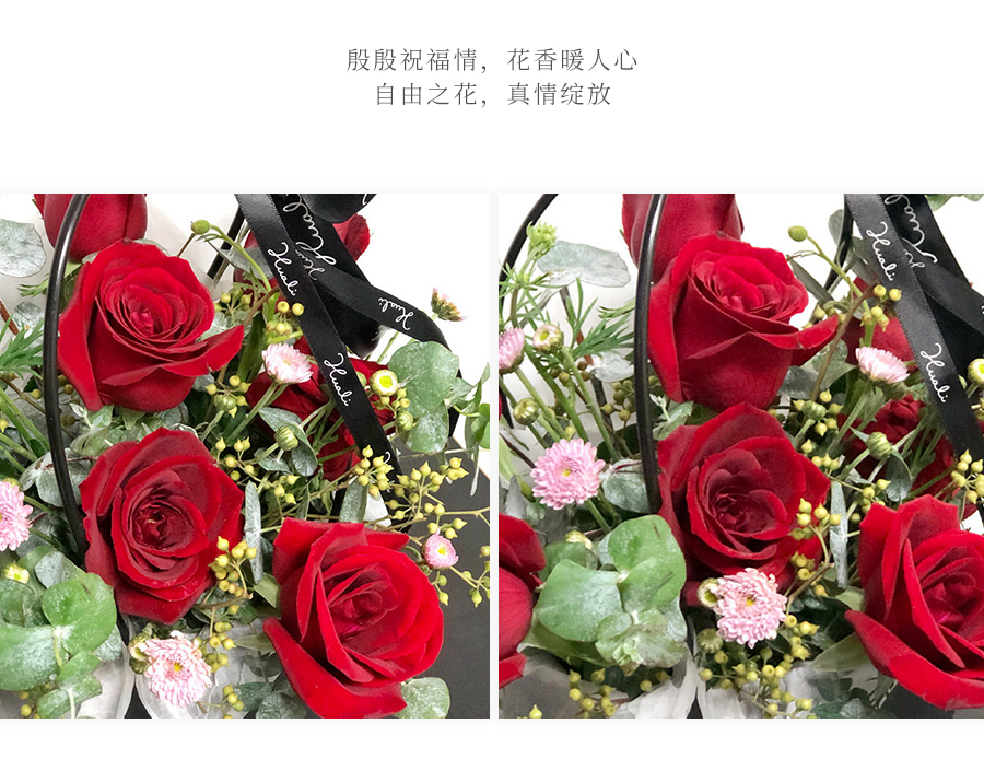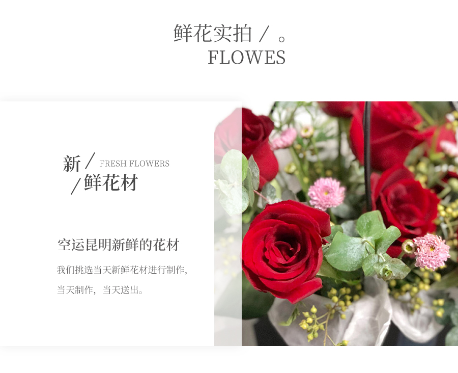 由于鮮花包扎的花藝師不同,可能在花束的形式和搭配上與圖片略有小的區(qū)別,但我們保證鮮花的主花材品種、新鮮程度、數(shù)量、顏色與說(shuō)明一致,感謝您的理解。