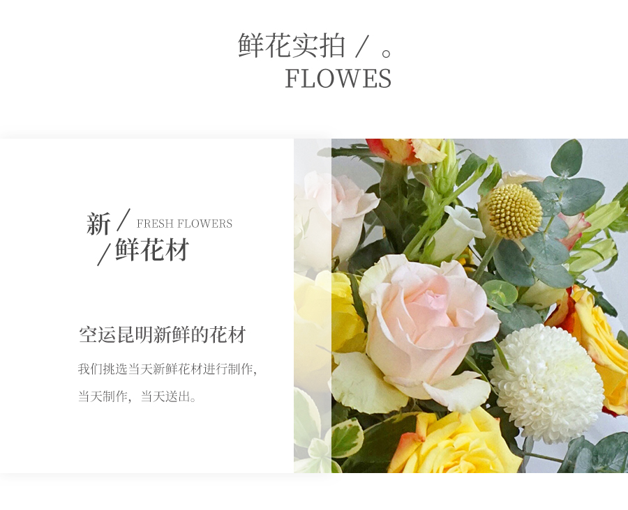 由于鮮花包扎的花藝師不同,可能在花束的形式和搭配上與圖片略有小的區(qū)別,但我們保證鮮花的主花材品種、新鮮程度、數(shù)量、顏色與說明一致,感謝您的理解。