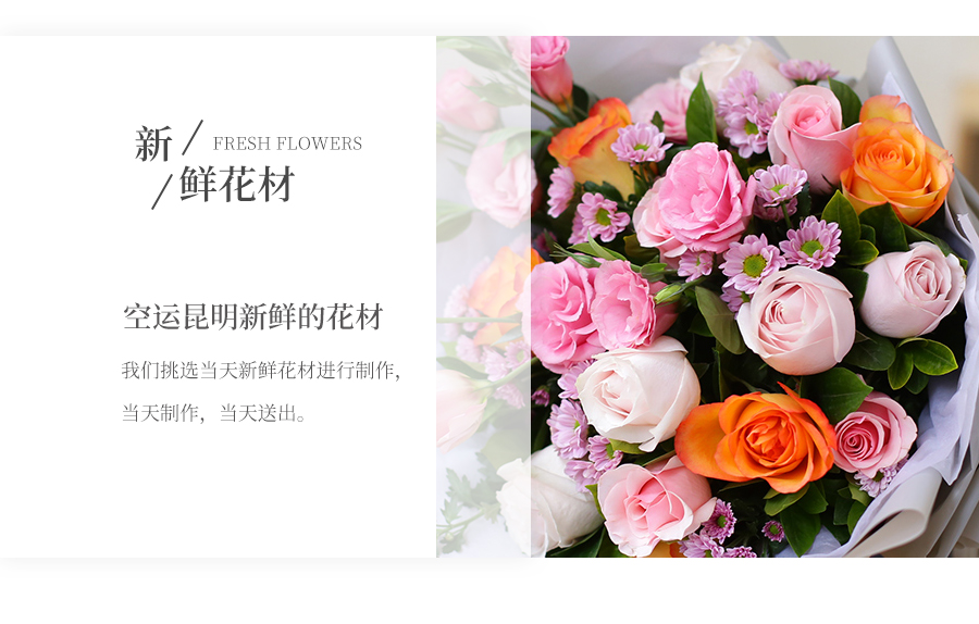由于鮮花包扎的花藝師不同,可能在花束的形式和搭配上與圖片略有小的區(qū)別,但我們保證鮮花的主花材品種、新鮮程度、數量、顏色與說明一致,感謝您的理解。