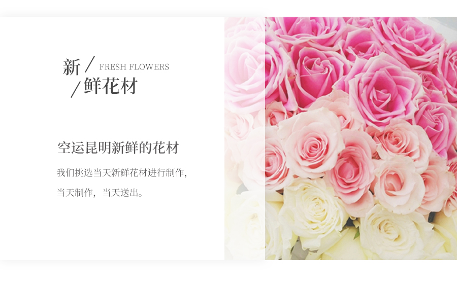 由于鮮花包扎的花藝師不同,可能在花束的形式和搭配上與圖片略有小的區(qū)別,但我們保證鮮花的主花材品種、新鮮程度、數(shù)量、顏色與說明一致,感謝您的理解。