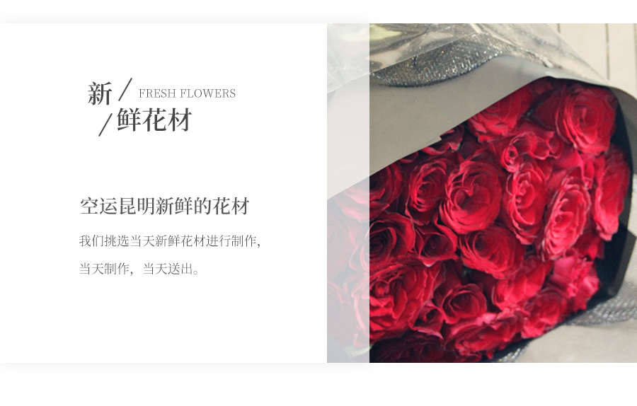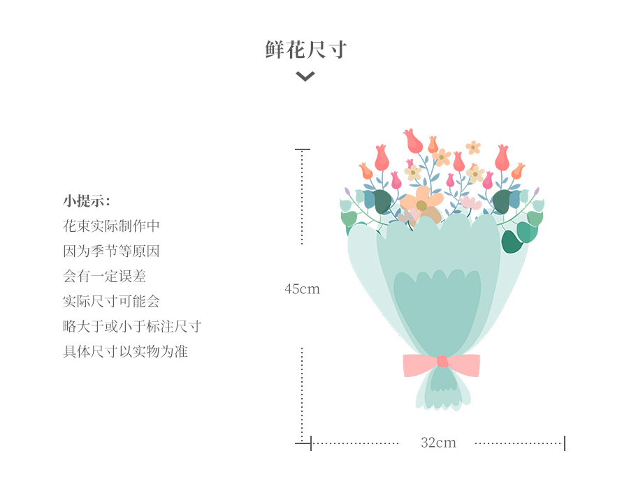 由于鮮花包扎的花藝師不同,可能在花束的形式和搭配上與圖片略有小的區(qū)別,但我們保證鮮花的主花材品種、新鮮程度、數(shù)量、顏色與說(shuō)明一致,感謝您的理解。