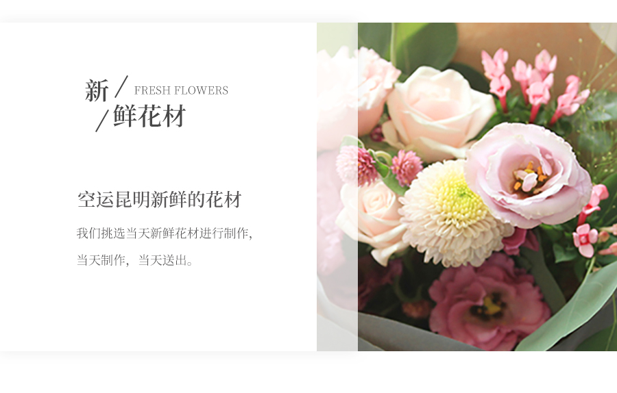 由于鮮花包扎的花藝師不同,可能在花束的形式和搭配上與圖片略有小的區(qū)別,但我們保證鮮花的主花材品種、新鮮程度、數(shù)量、顏色與說明一致,感謝您的理解。