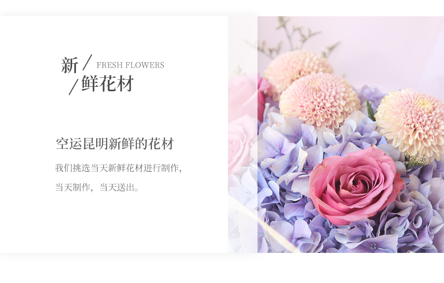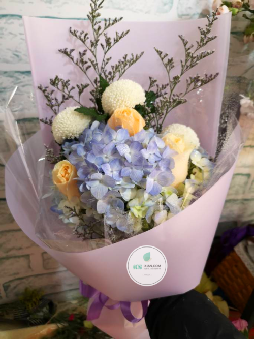 由于鮮花包扎的花藝師不同,可能在花束的形式和搭配上與圖片略有小的區(qū)別,但我們保證鮮花的主花材品種、新鮮程度、數(shù)量、顏色與說明一致,感謝您的理解。