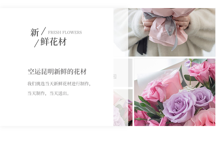 由于鮮花包扎的花藝師不同,可能在花束的形式和搭配上與圖片略有小的區(qū)別,但我們保證鮮花的主花材品種、新鮮程度、數(shù)量、顏色與說明一致,感謝您的理解。
