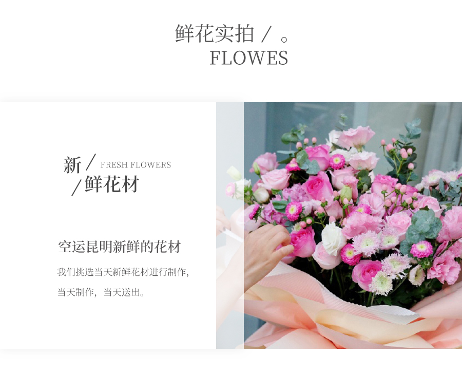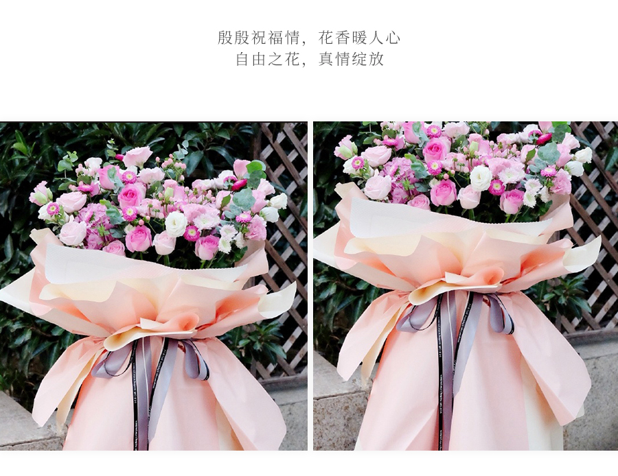 由于鮮花包扎的花藝師不同,可能在花束的形式和搭配上與圖片略有小的區(qū)別,但我們保證鮮花的主花材品種、新鮮程度、數(shù)量、顏色與說明一致,感謝您的理解。
