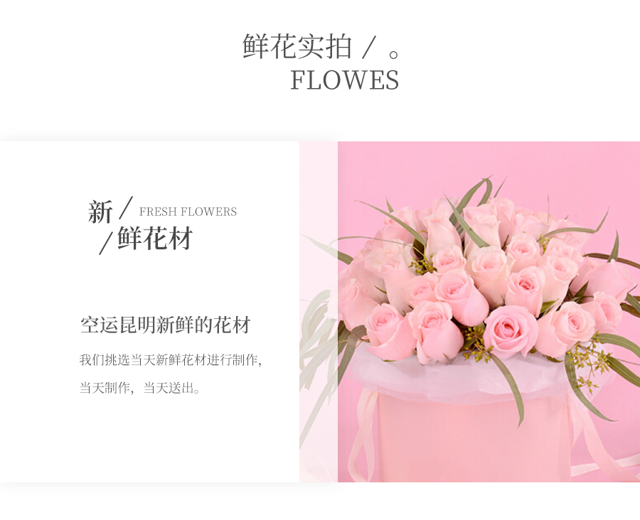 由于鮮花包扎的花藝師不同,可能在花束的形式和搭配上與圖片略有小的區(qū)別,但我們保證鮮花的主花材品種、新鮮程度、數(shù)量、顏色與說明一致,感謝您的理解。