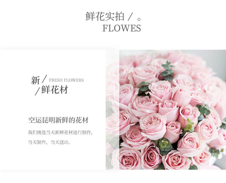 由于鮮花包扎的花藝師不同,可能在花束的形式和搭配上與圖片略有小的區(qū)別,但我們保證鮮花的主花材品種、新鮮程度、數(shù)量、顏色與說明一致,感謝您的理解。