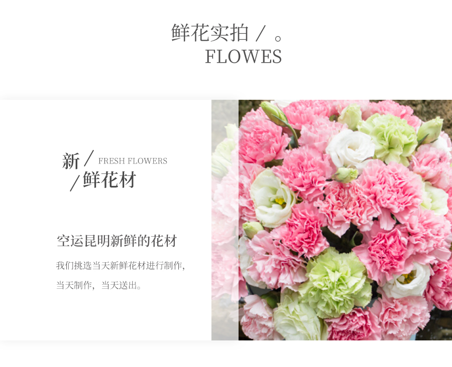 由于鮮花包扎的花藝師不同,可能在花束的形式和搭配上與圖片略有小的區(qū)別,但我們保證鮮花的主花材品種、新鮮程度、數(shù)量、顏色與說明一致,感謝您的理解。