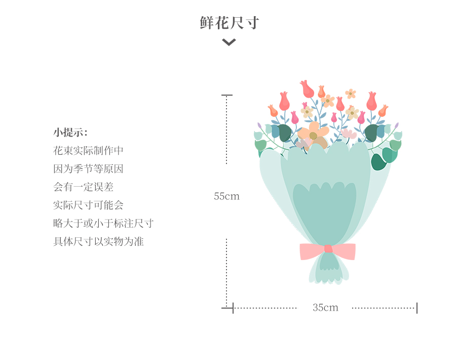 由于鮮花包扎的花藝師不同,可能在花束的形式和搭配上與圖片略有小的區(qū)別,但我們保證鮮花的主花材品種、新鮮程度、數(shù)量、顏色與說(shuō)明一致,感謝您的理解。