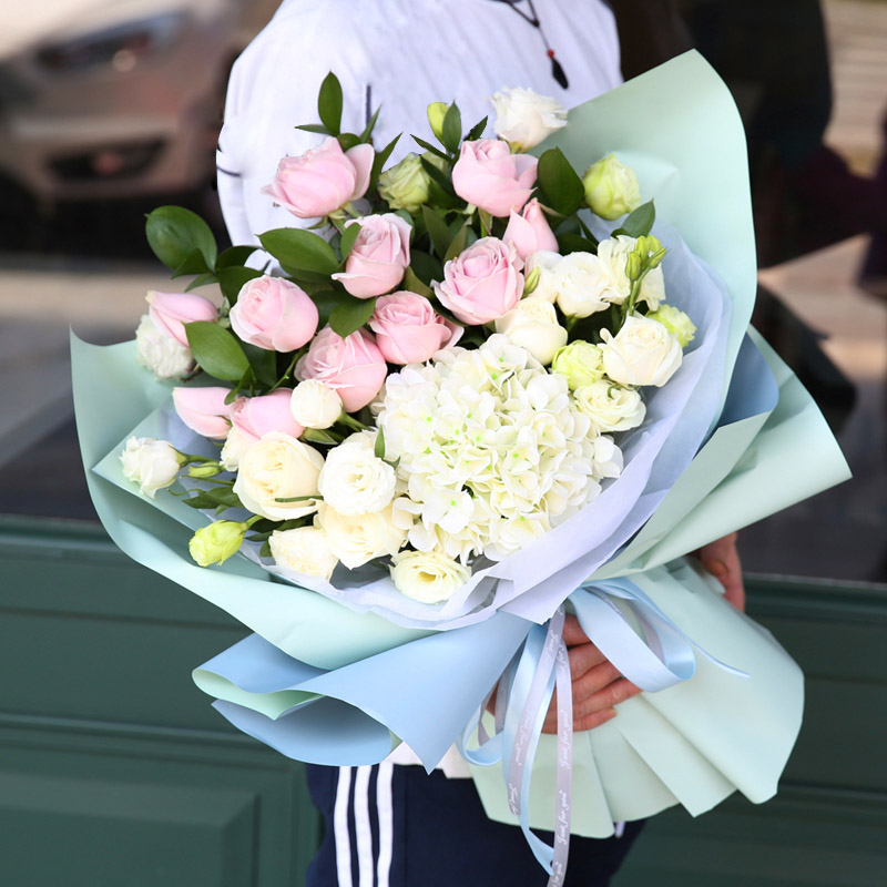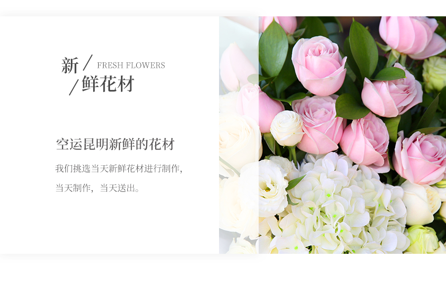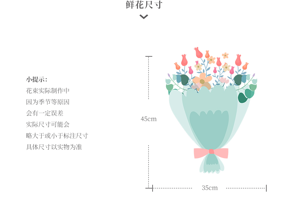 由于鮮花包扎的花藝師不同,可能在花束的形式和搭配上與圖片略有小的區(qū)別,但我們保證鮮花的主花材品種、新鮮程度、數(shù)量、顏色與說明一致,感謝您的理解。