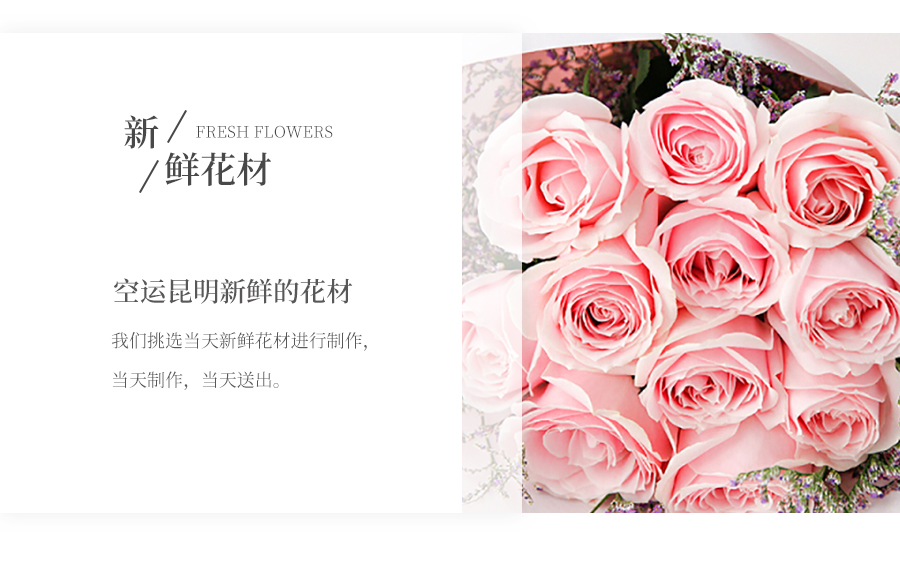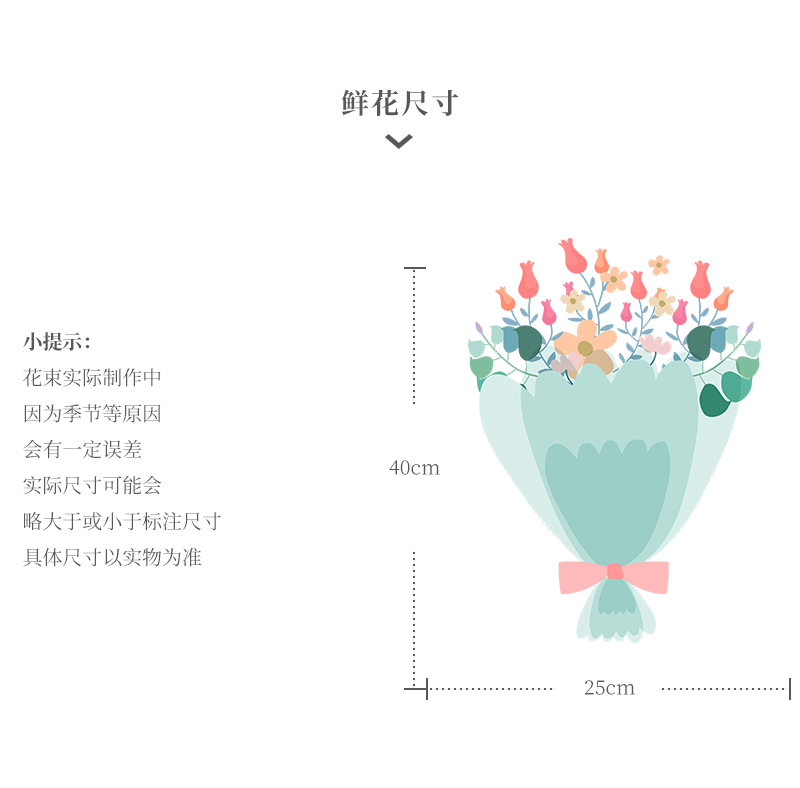 由于鮮花包扎的花藝師不同,可能在花束的形式和搭配上與圖片略有小的區(qū)別,但我們保證鮮花的主花材品種、新鮮程度、數(shù)量、顏色與說(shuō)明一致,感謝您的理解。