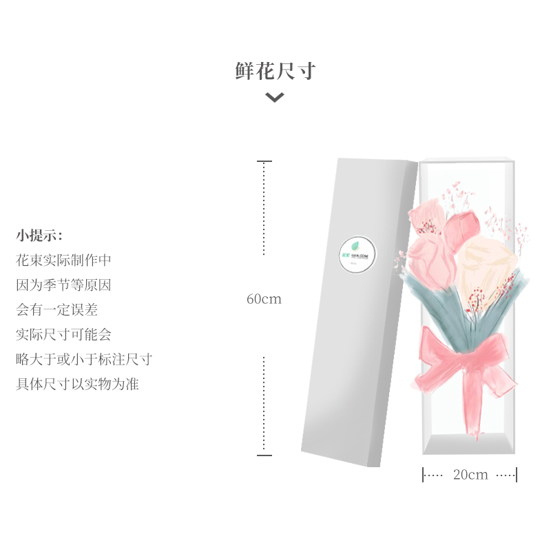 由于鮮花包扎的花藝師不同,可能在花束的形式和搭配上與圖片略有小的區(qū)別,但我們保證鮮花的主花材品種、新鮮程度、數(shù)量、顏色與說明一致,感謝您的理解。