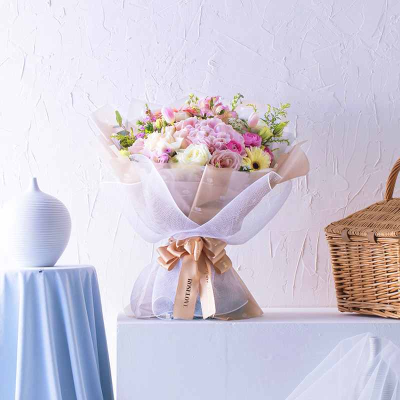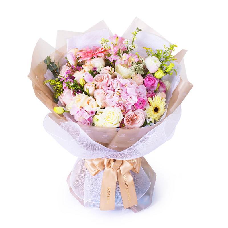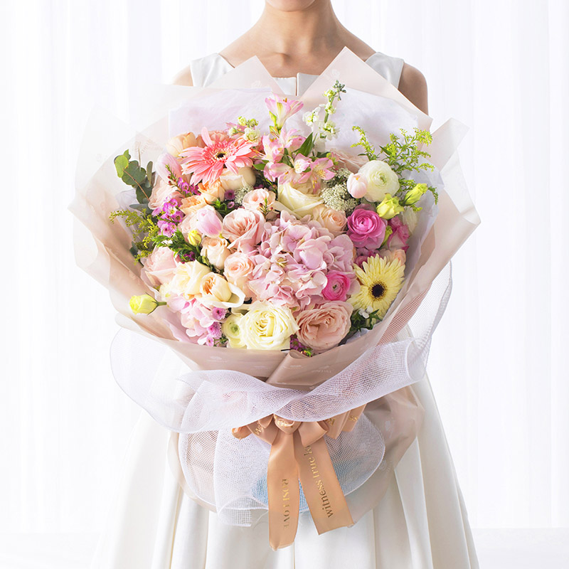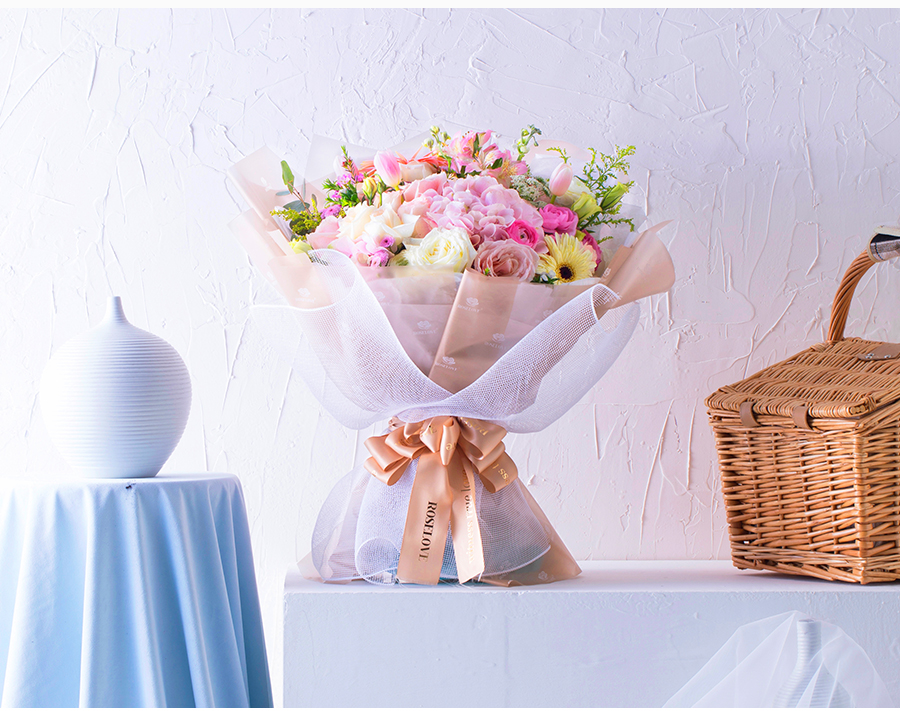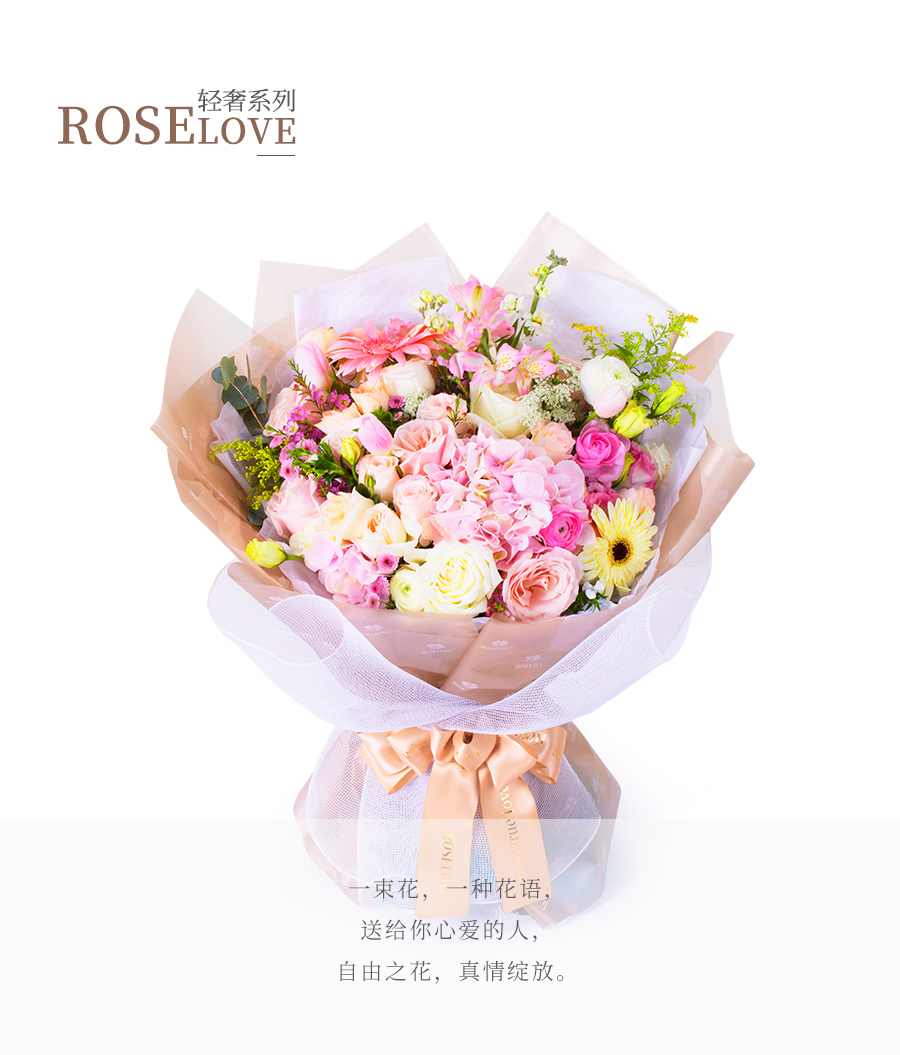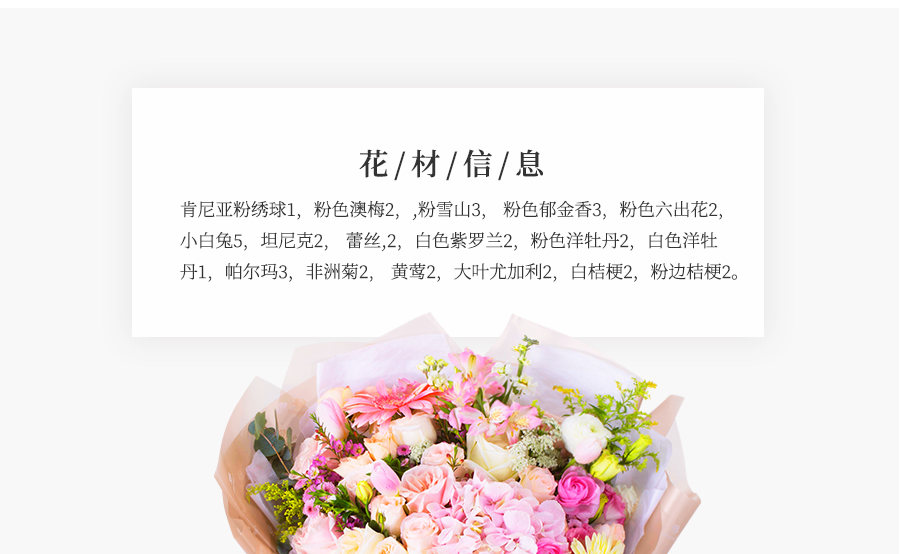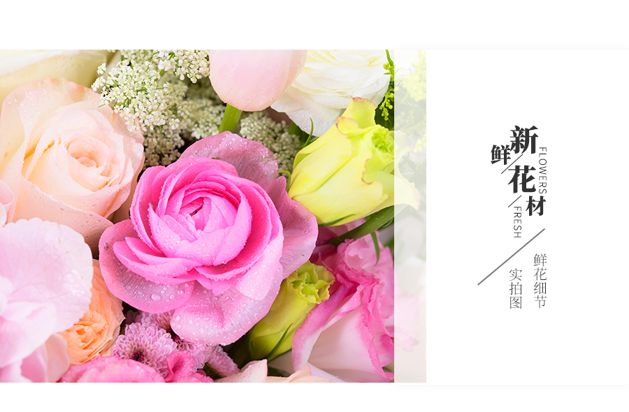 由于鮮花包扎的花藝師不同,可能在花束的形式和搭配上與圖片略有小的區(qū)別,但我們保證鮮花的主花材品種、新鮮程度、數(shù)量、顏色與說明一致,感謝您的理解。